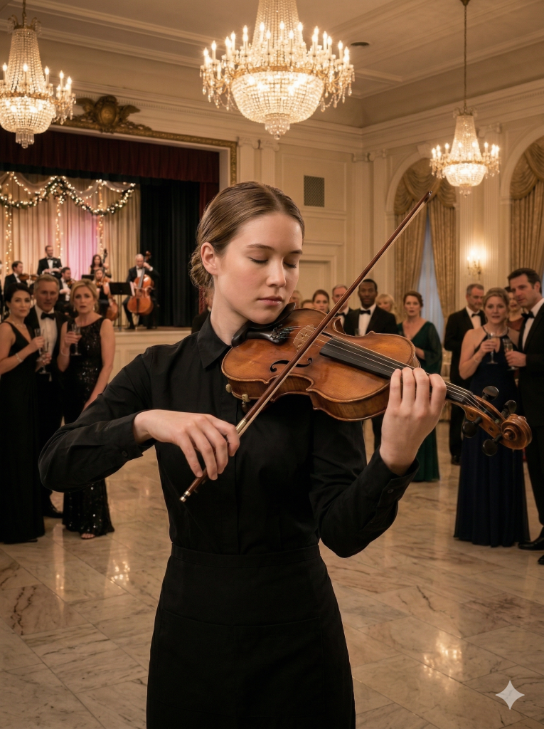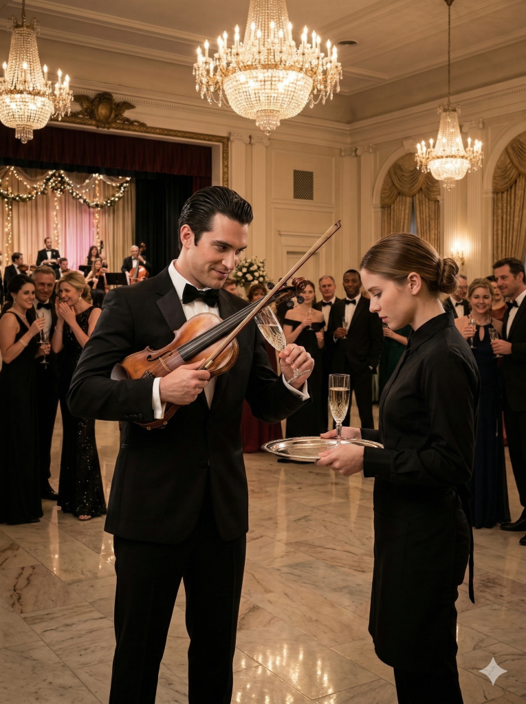 Разговоры стихли мгновенно. Люстры словно задрожали, когда звук разлился по залу и превратился во что-то гораздо более мощное, чем кто-либо ожидал. Молодая официантка не выглядела взволнованной. Её глаза были закрыты, поза спокойной, движения точными.