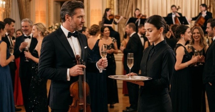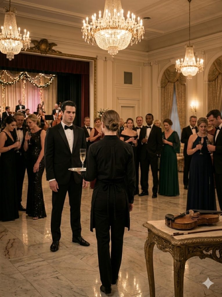 У одного из длинных столов стояла молодая официантка с подносом, полным бокалов шампанского. Она двигалась осторожно, почти бесшумно, как человек, привыкший быть незаметным в мире богатых людей. Её чёрная форма идеально сливалась с фоном, а взгляд никогда не задерживался на гостях дольше, чем это было необходимо.